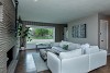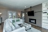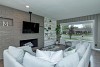 • Bright living/entertaining room with huge picture window to the front and French doors that open to the back deck. Feature wall with floor to ceiling stone fireplace surround and custom built-ins.