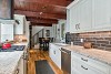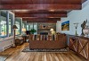 • Great room/dining room with wide plank wood floors, beamed ceiling, stone faced gas log fireplace and expansive windows overlooking a flagstone terrace and the back yard beyond.
