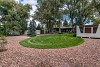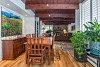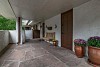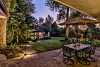 • Sunroom overlooking an adjacent flagstone terrace and the lushly landscaped back yard.