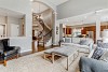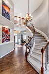 Dramatic two-story entry with sweeping wood and iron staircase.