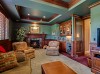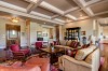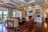 Spacious great room with fireplace and custom box beam ceiling detail and millwork overlooking the main level deck and fairways beyond.