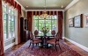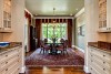 Formal dining room with crown molding and adjacent butler pantry.