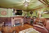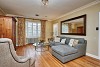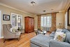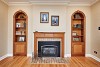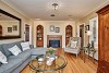 Sunny living room with bay window, fireplace with custom built-ins, wood floors and crown molding.