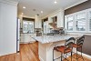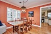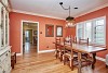 Formal dining room with wood floors and crown molding opens to the kitchen.