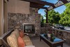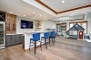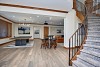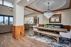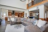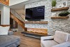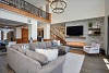 Dramatic, two-story great room with new wide plank wood floors, linear, steam fireplace with split stone façade and bi-parting doors opening to the main level deck and fairway and mountain views.