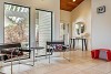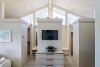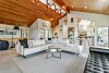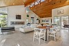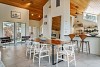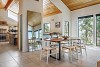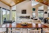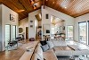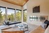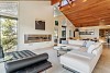 Dramatic, vaulted great room/dining room with floor to ceiling glass offering commanding mountain views, linear fireplace, wood ceiling and radiant heat under oversized porcelain tile floors.