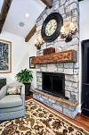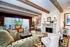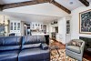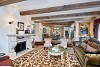 Formal living room with wood floors, cast stone fireplace, exceptional millwork and beam work and sliding doors opening to the front terrace is perfect for entertaining family and friends.