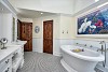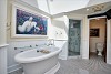 The primary suite is spacious and features a fireplace and balcony plus a newer bath with dual vanities, oversized shower with multiple shower heads and free standing tub as well as dual walk-in closets. The bath is filled with sunlight from the skylights above.