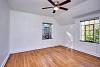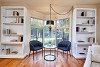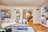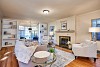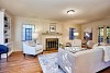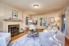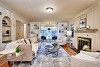 Spacious living room with fireplace with custom millwork surround, front bay window, refinished wood floors and French doors leading to the covered and screened patio.