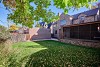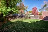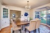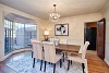Formal dining room with a bay window overlooking the lushly landscaped and fenced back yard.