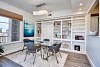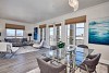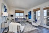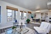Open living/dining area with expansive windows and high ceilings accesses the balcony overlooking Cherry Creek.
