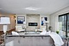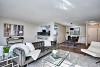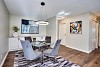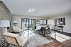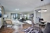 Large, open great room with fireplace and separate dining area and open kitchen with eating bar.