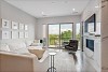 Open living/dining area with expansive windows, linear fireplace with tile facade and high ceilings accesses the balcony overlooking the greenbelt and mountain views.