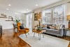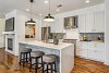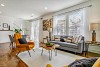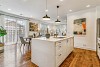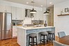 Open kitchen with center island includes new European style cabinetry, quartz counters with waterfall island and high-end stainless appliances.