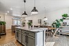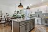 penny tile backsplash. Pendant lighting illuminates the
