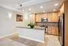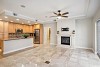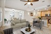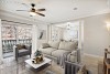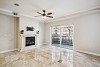 Open and spacious living area with stone tile floors with mosaic inset, fireplace with cast stone surround and large west facing sliding door opening to your private balcony overlooking the tree lined street.
