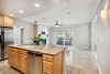 Spacious kitchen with light wood cabinetry, center island with eating bar, slab granite counters, tile backsplach and stainless appliances.