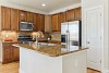 Spacious Gourmet kitchen with stainless steel appliances, gas range, granite countertops, and tile backsplash