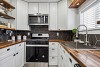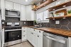An efficient with soft close cabinetry, butcher block counters, ceramic back splash and stainless appliances including a gas range.